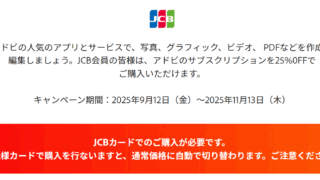 JCBでの購入でAdobe製品が25%OFF、11/13まで